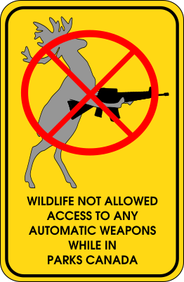 joke graphic meant to mimic road sign warning allowing deer and other wild animals the use of automatic weapons in Parks Canada