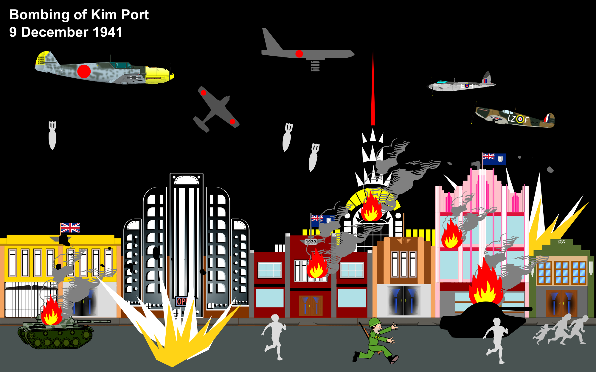 Japanese bombers raid the fictional British colony of Kim Port. British aircraft were seen intercepting. I can't find Japanese planes on Openclipart, therefore sorry for substituting with German planes (both were axis powers anyway)