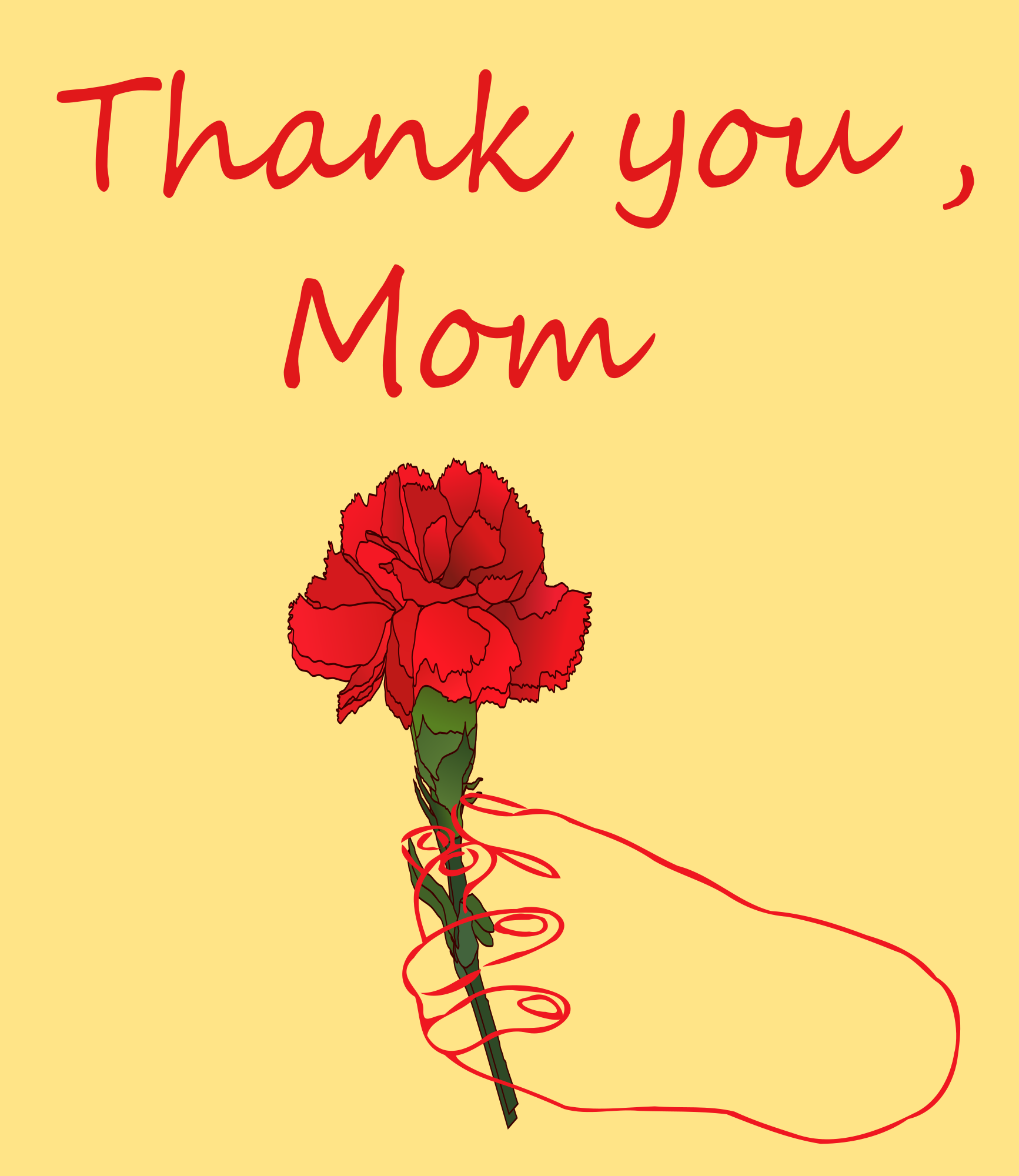 the word "Thank you, Mom" and a lineart of right hand with a red carnation.