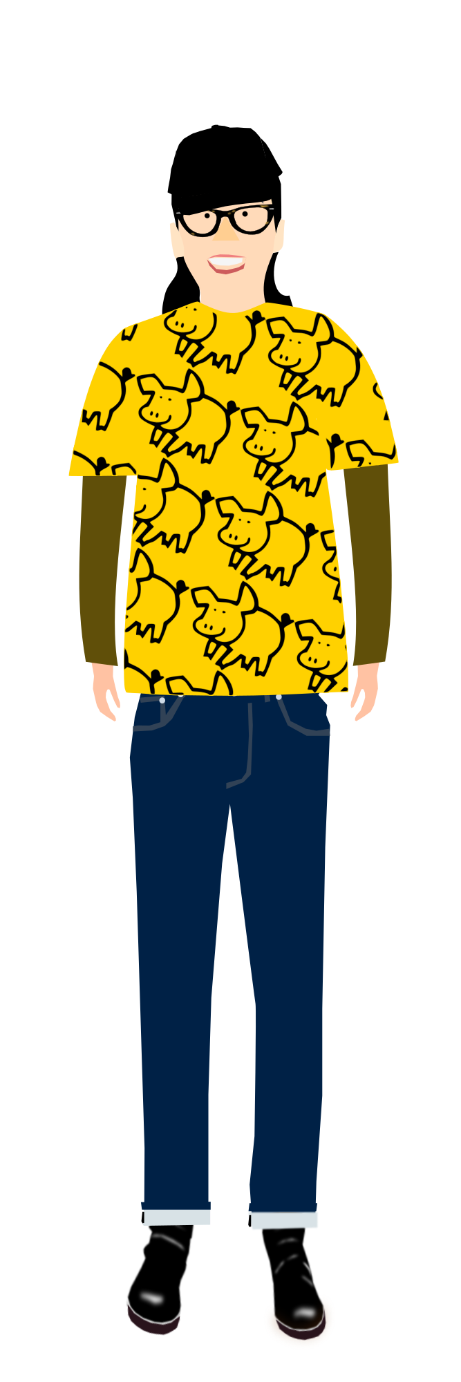 The image is a female character called "Asako" wearing a yellow T-shirt with a pig pattern . "Asako" is the avatar of "yamachem2".