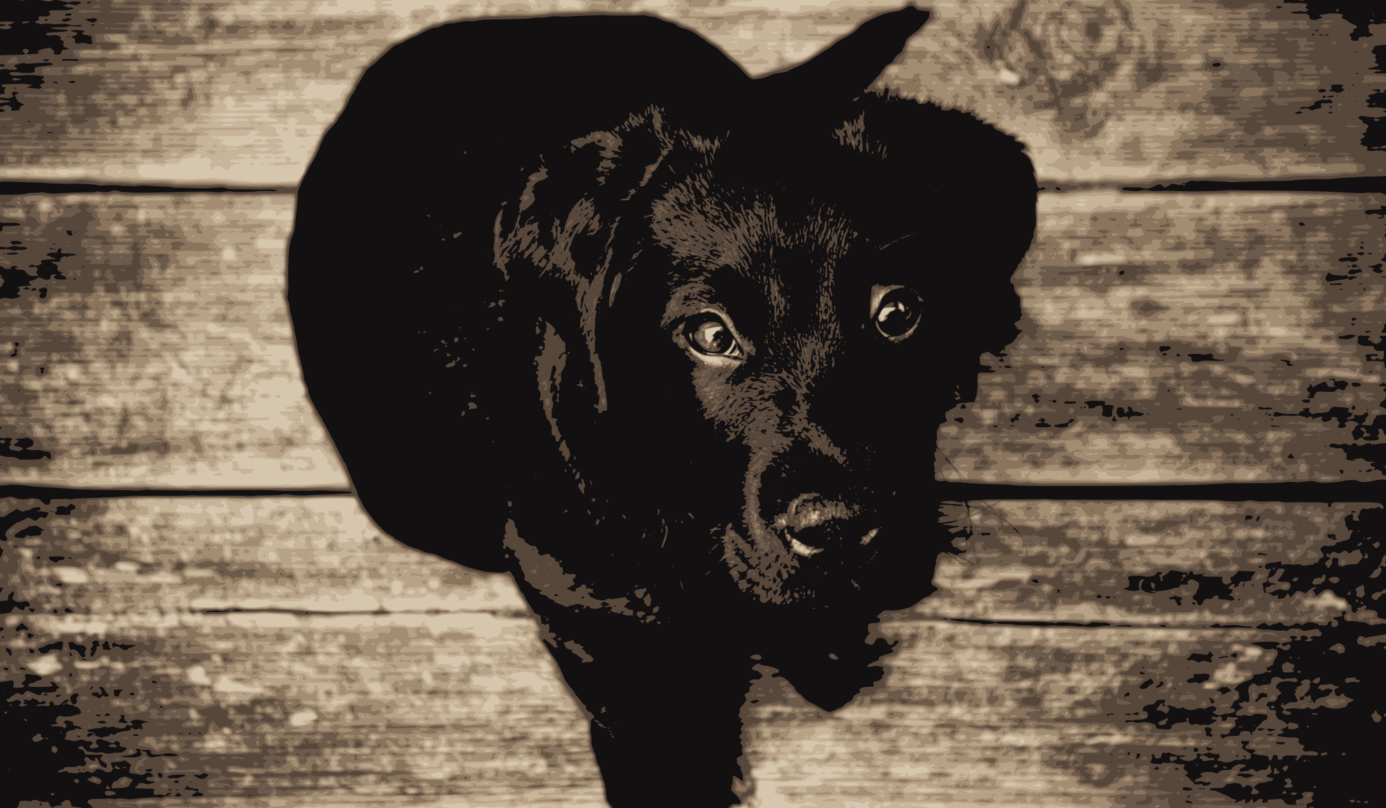 The image of a black-haired puppy or child-dog who is sitting on a wooden floor and staring at