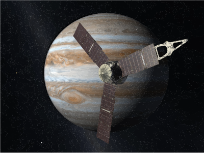 The Juno spacecraft in front of Jupiter.