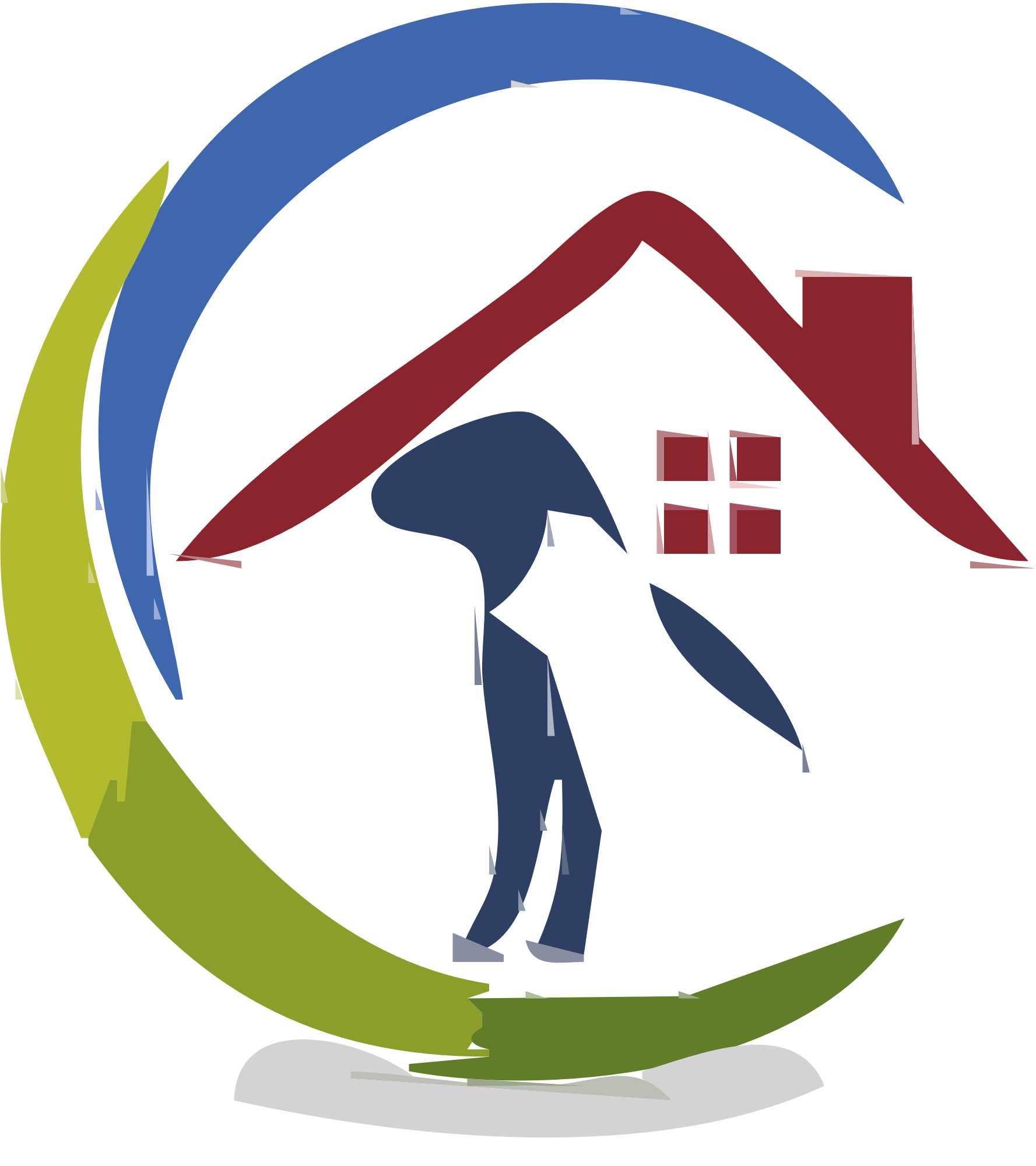 A vectorized cat shape under a red house roof.