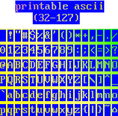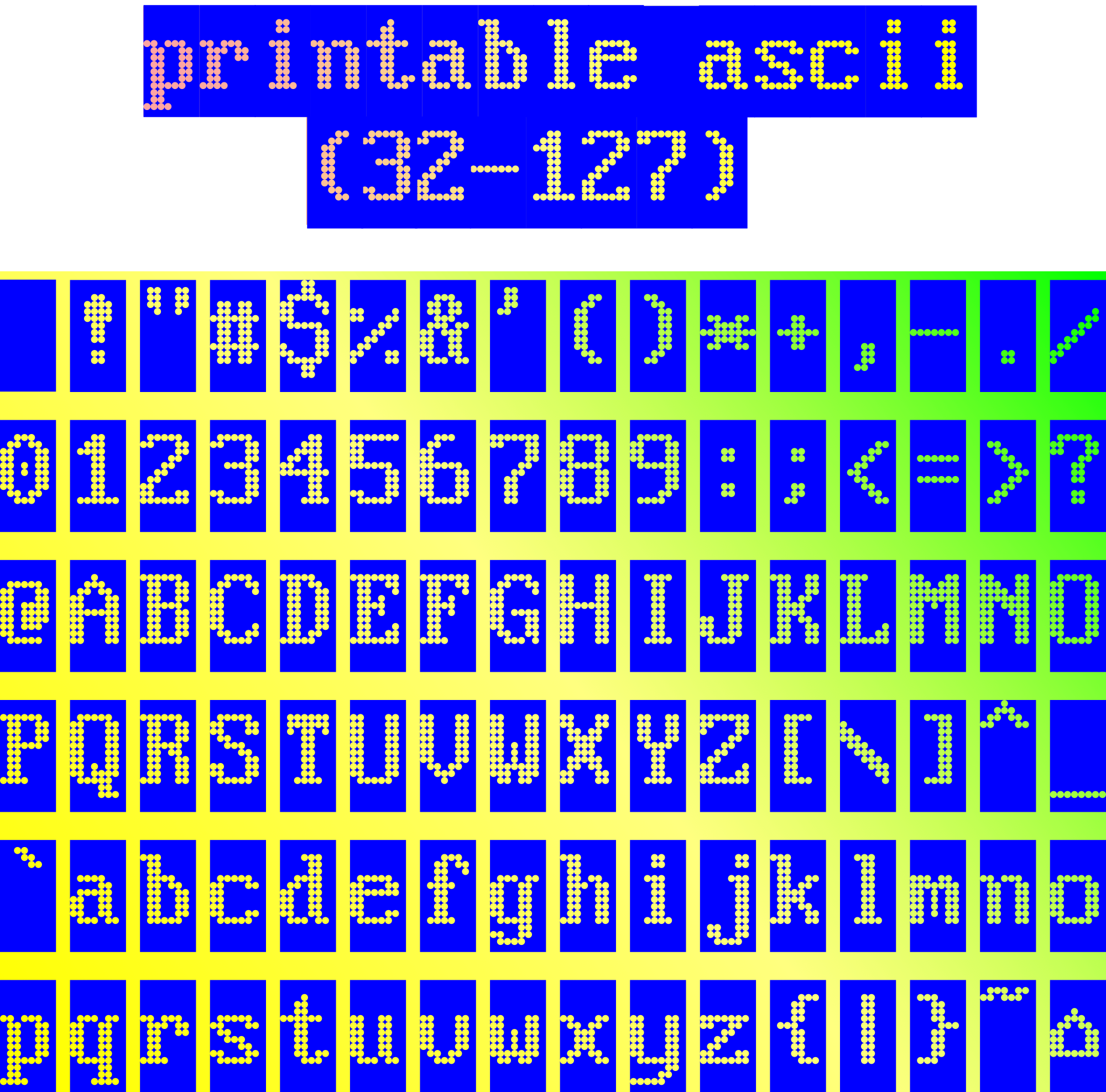 This is a collection of all lower, printable ascii codes (32-127) with holes instead of dots in blue ground. It is meant to put text character wise together and it isn't a font in a classical sense - it's a picture of 127-32 characters. To colorize the characters, put a colored rectangle below the character(s) (as shown here). Maybe upper (extended) ascii will follow (128-255).