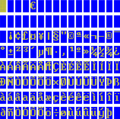 This is a collection of some upper, printable ascii codes (128-255), maybe close to ISO-latin-1 with yellow dots (filled circles) on blue ground.