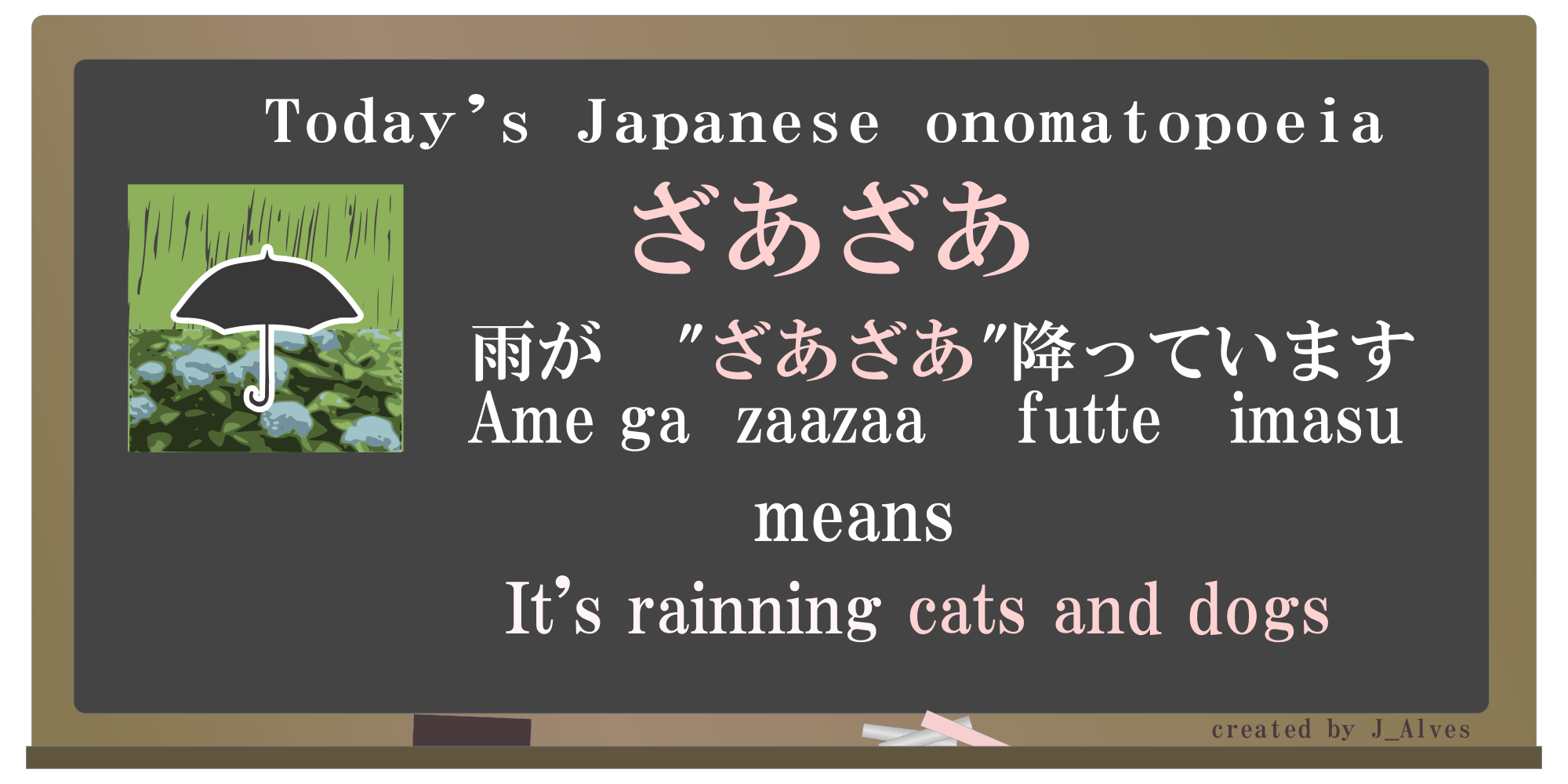 The image is a blackboard, on which a Japanese onomatopoeia called "ざあざあ" in hiragana or "zaazaa" is depicted.
