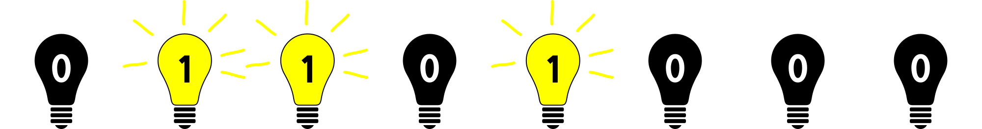 A graphical representation of an eight-bit binary string (a byte) with light bulbs; 0 is OFF, 1 is ON. Derived from https://openclipart.org/detail/155965/light-bulb-minimal-design by MrTossum