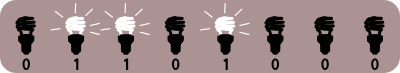 A graphical representation of an eight-bit binary string (a byte) with compact fluorescent light (CFL) bulbs; 0 is OFF, 1 is ON. Derived from https://openclipart.org/detail/211232/compact-fluorescent-light-bulb by jhnri4