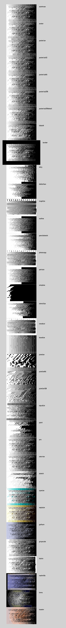 The complete list of upload+filters, scaled to same size and reordered for a better view. Test image traced was containing various black to white transitions, from grayscale gradients to pointillistic and hatched lines, in the vein of the #feather trace and #newsprint trace (#223517 and #223575).