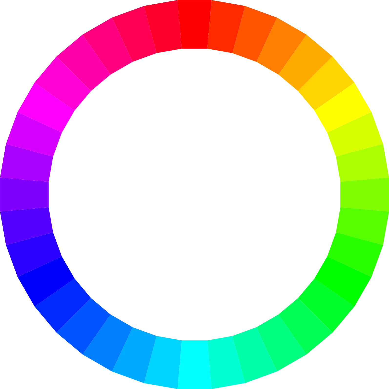 Color wheel, with 36 patches of colors (one every 10 degrees). SVG source-code was hand-written and is very clean and easy to edit.