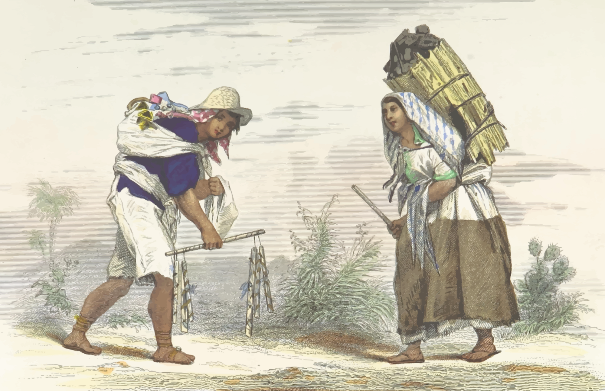 An Indian (left) and a coal merchant (right). From a drawing in 'L'Amérique centrale et méridionale', Louis Enault, 1867.