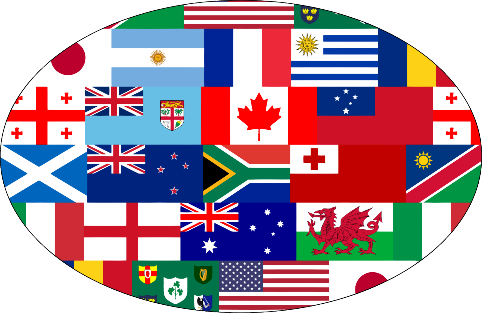 Since the rugby union world cup began this evening, here is a rugby ball incorporating the flags of all 20 nations competing the finals. For the sharp-eyed observer that doesn't recognised the one bottom and slightly left, it is of the Irish Rugby Football Union. Rugby union is an all-Ireland sport, so neither the flag of the Irish Republic nor the union flag of Northern Ireland is appropriate. Good luck to all the teams!
