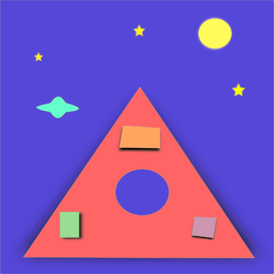 This is a fantastic image which depicts a moon,stars, a UFO and a pyramid.
