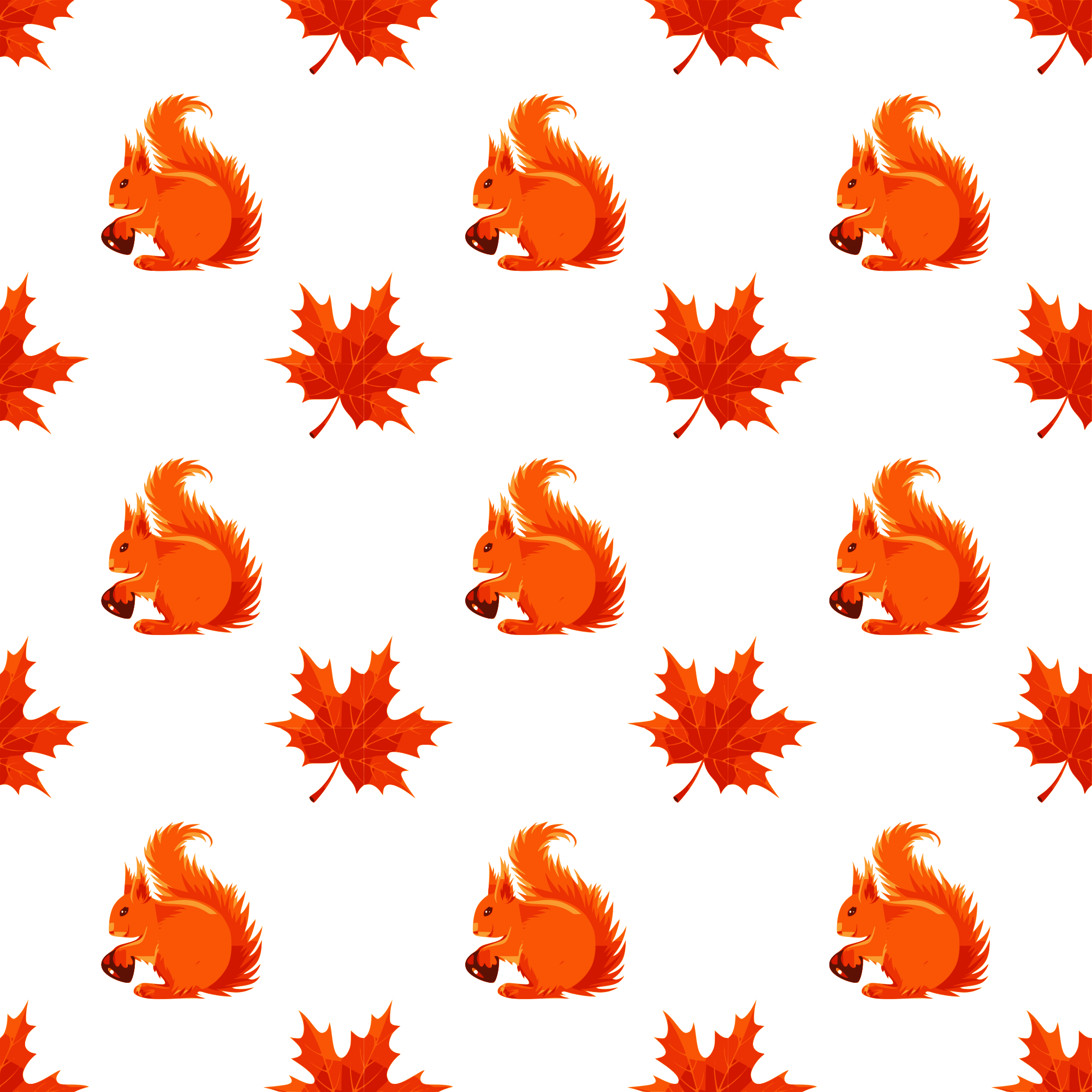 This is a seamless pattern which depicts autumn-related things including a squirrel holding a chestnut and a red maple leaf.