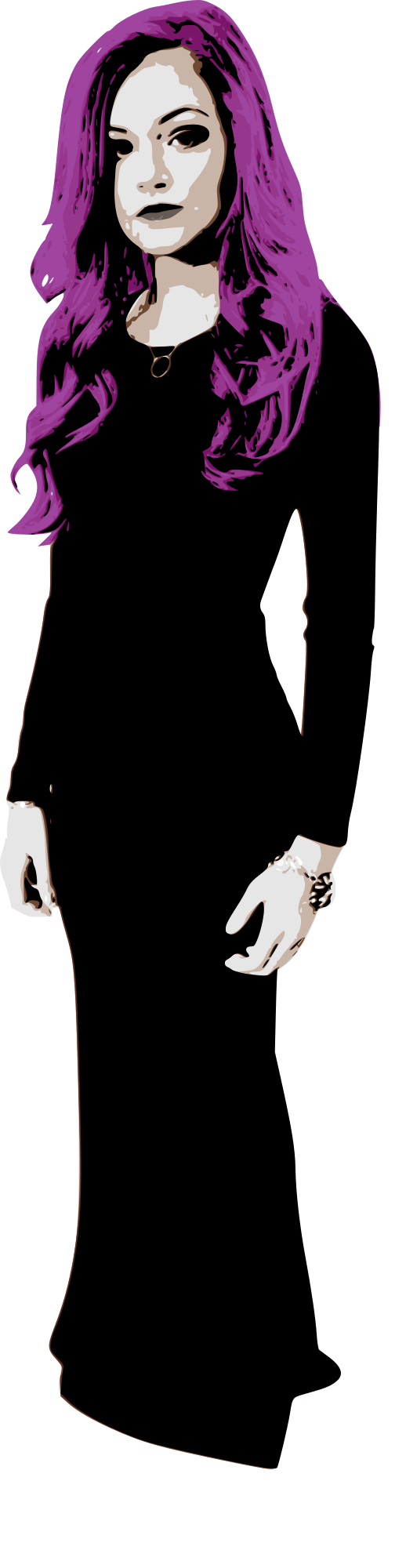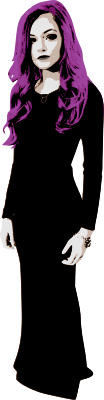 A purple haired woman in a black dress. A bit of a goth perhaps.