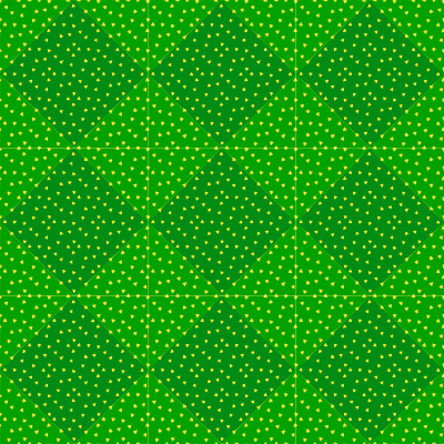This is a seamless pattern with rhombus as geometry and dispersed small yellow triangles and BG in green.