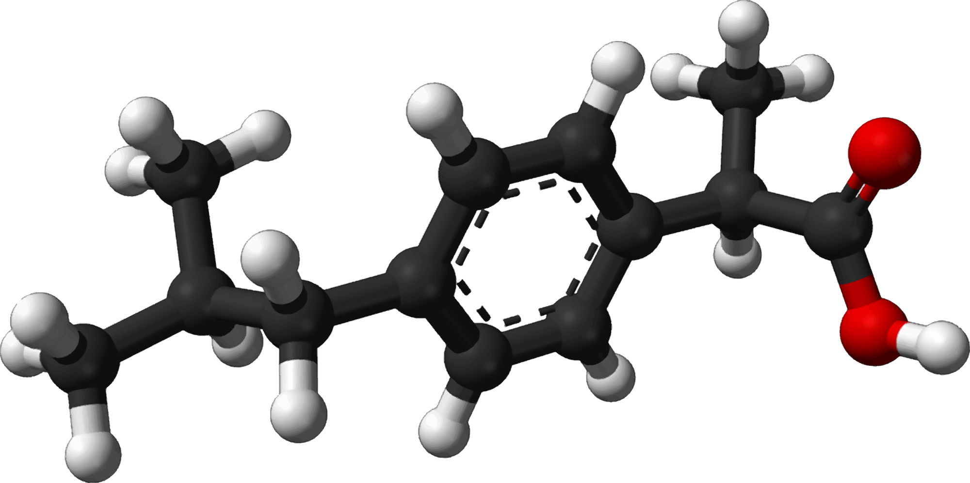 Isobutylphenylpropanoic acid (ibuprofen) molecule from a public domain image on Wikipedia Commons.