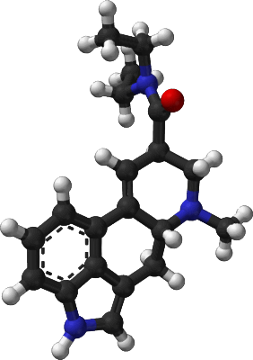 Lysergic acid diethylamide (LSD) molecule from a public domain image on Wikipedia Commons.