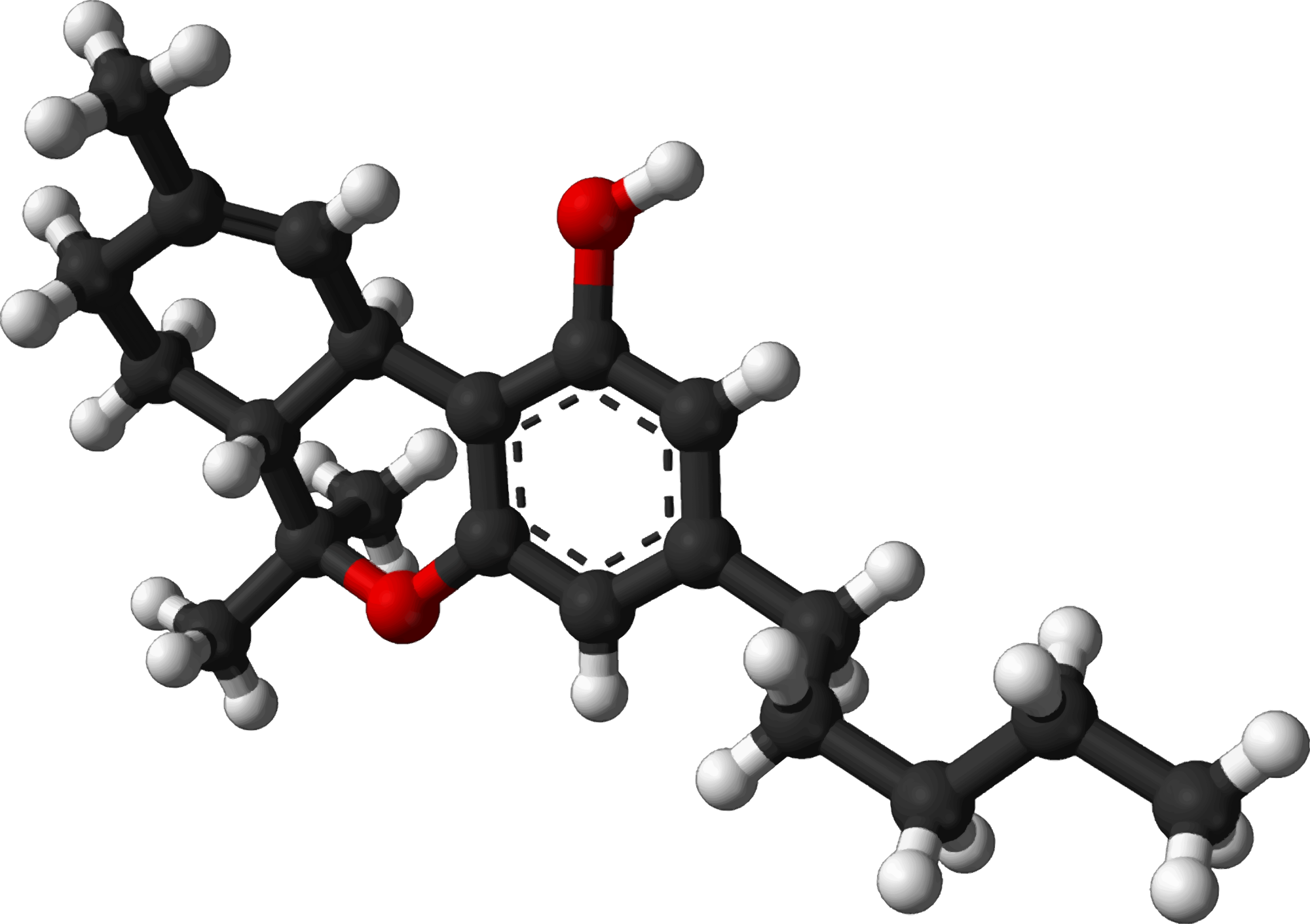 Delta-9-tetrahydrocannabinol (psychoactive component in cannabis) molecule from a public domain image on Wikipedia Commons.