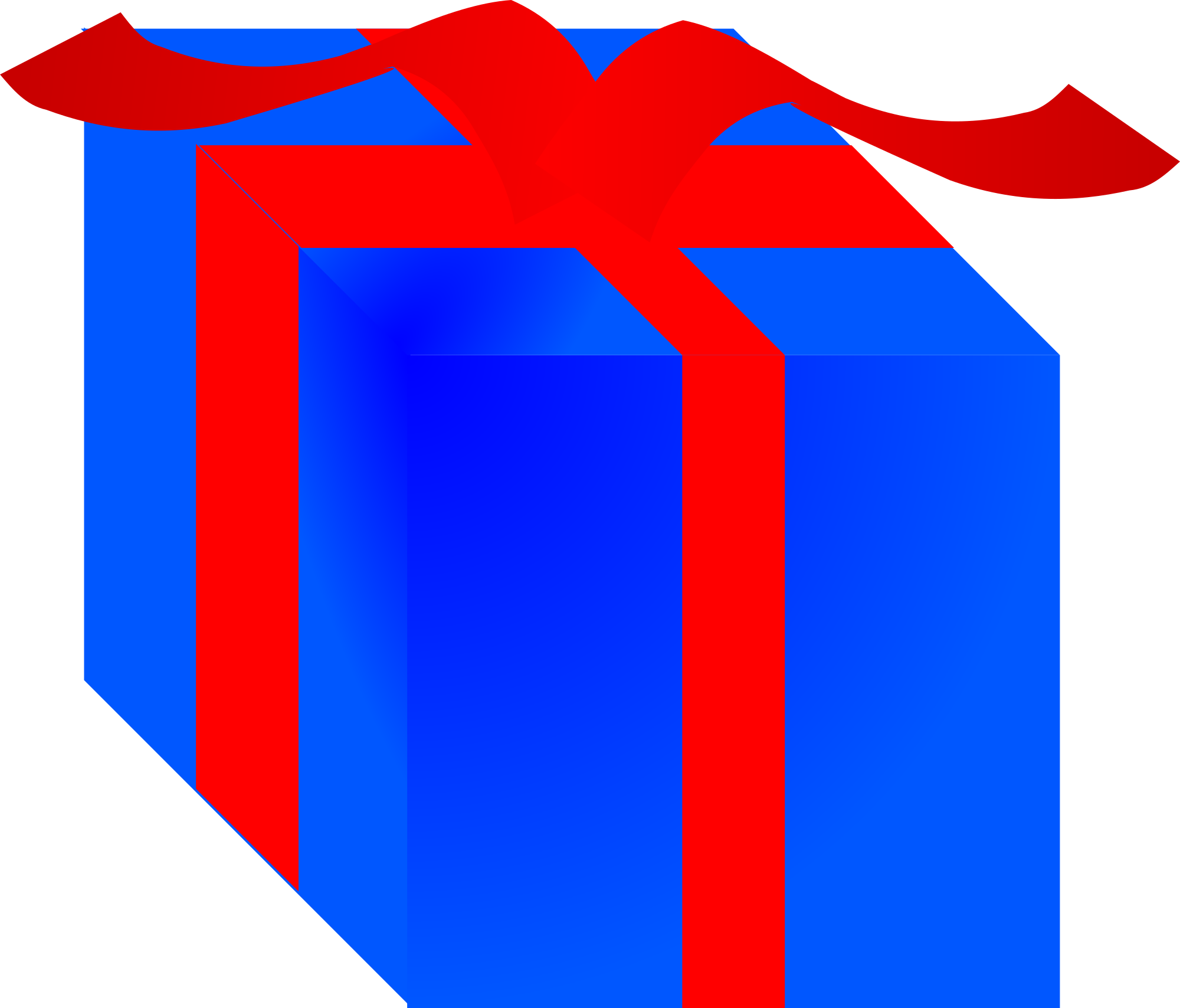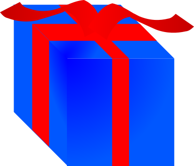 A blue gift box wrapped with a red ribbon.