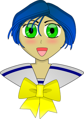 Anime schoolgirl with blue hair, green eyes, and a big yellow bow.