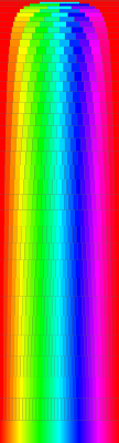 One gradient transformed to fill a grid of separate seemingly flat coloured rectangles which all have the same area.