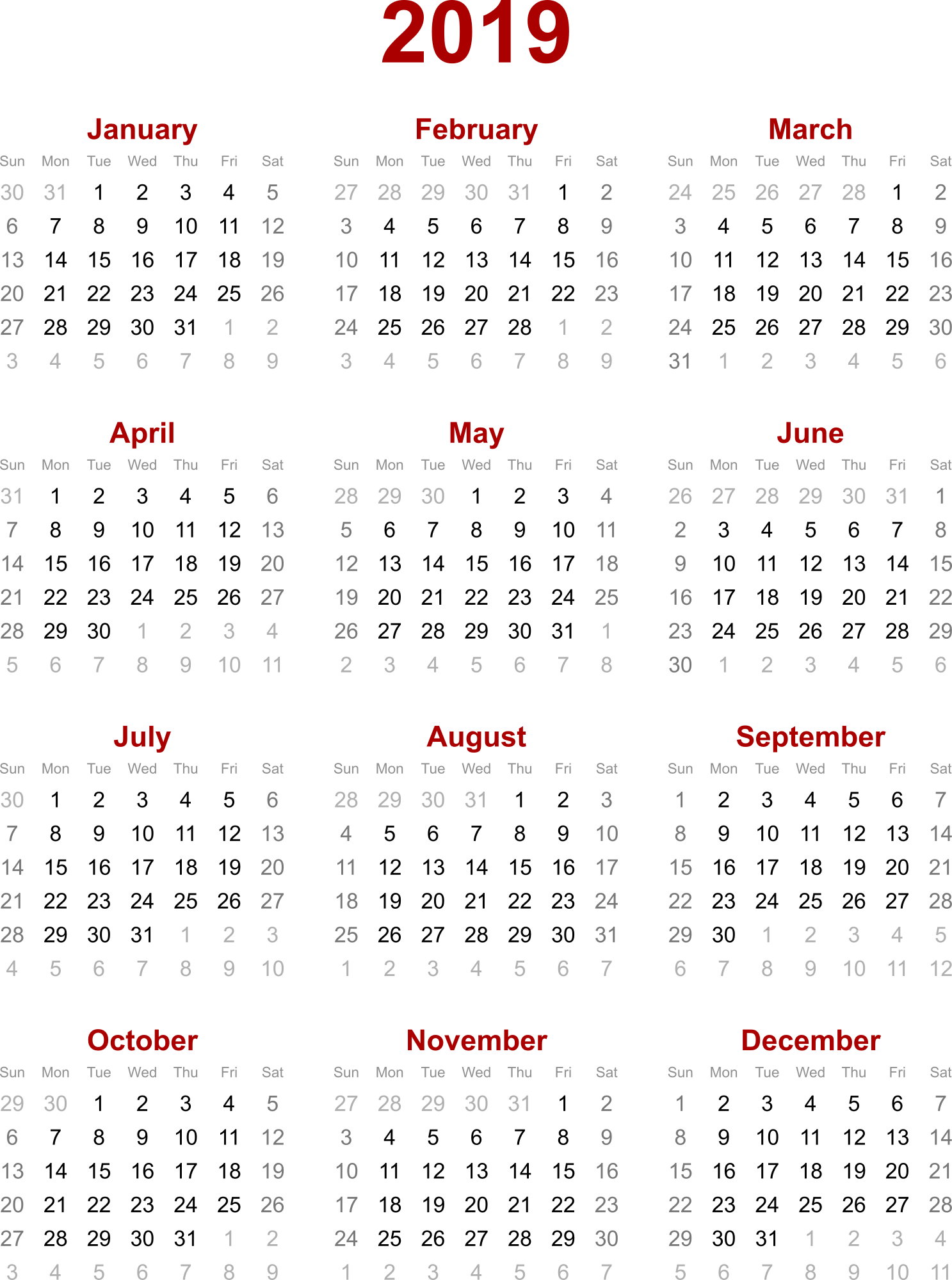 Yearly calendar for 2019.