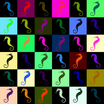 A chequerboard-style seahorse pattern. The seahorse outline is modified from a posting by GDJ. This is the original except with random colours.