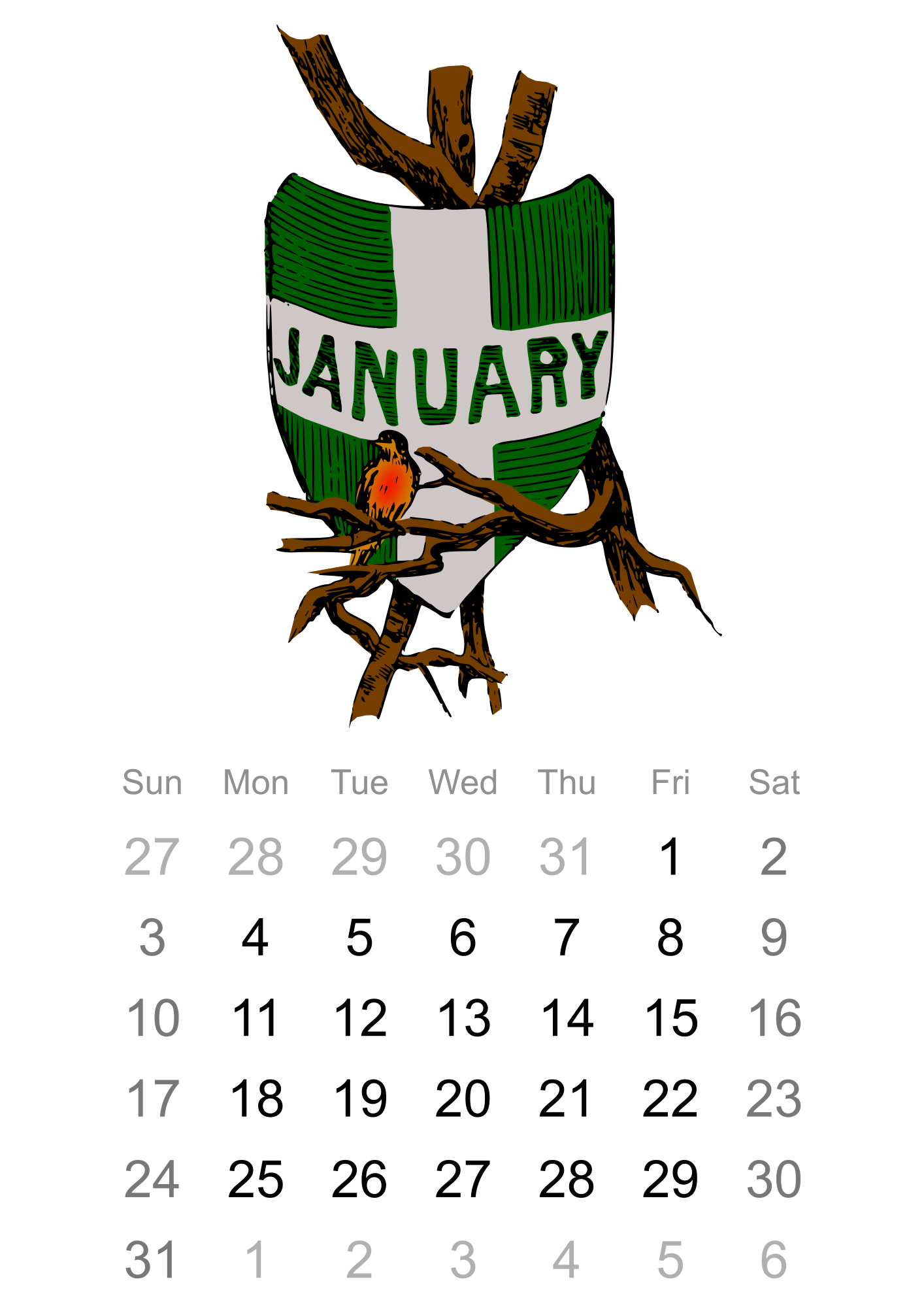 An illustrated monthly calendar for January 2016.