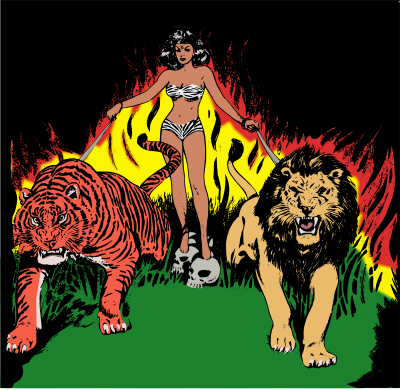 - Semi-Realistic People bikini comic fantasy fire girl jungle lady lion pinup pulp queen skull swimsuit tiger woman temptress