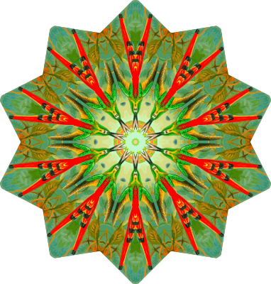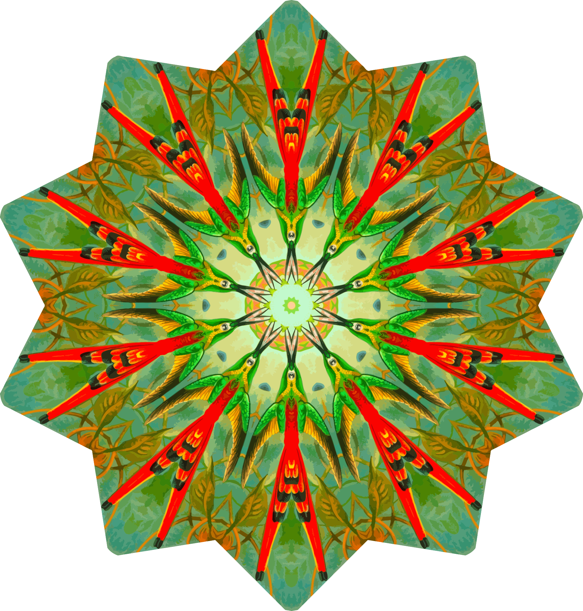 A colourful design with approximate rotational symmetry formed from a drawing of hummingbirds by Ernst Haeckel. The design was drawn as a PNG in Paint.net by repeated rotation of wedges of the drawing around a centre point. It was vectorized in Vector Magic.