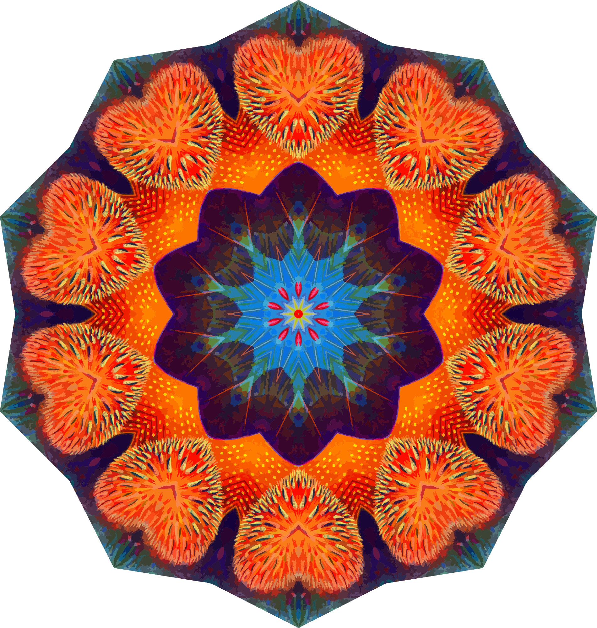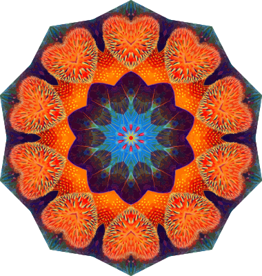 A colourful design with approximate rotational symmetry formed from a drawing of sea anemone by Ernst Haeckel. The design was drawn as a PNG in Paint.net by repeated rotation of wedges of the drawing around a centre point. It was vectorized in Vector Magic.