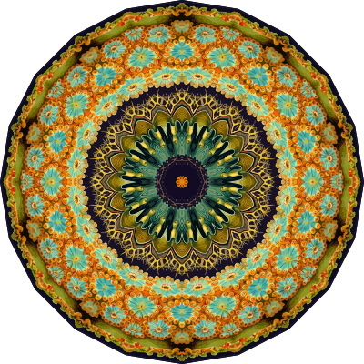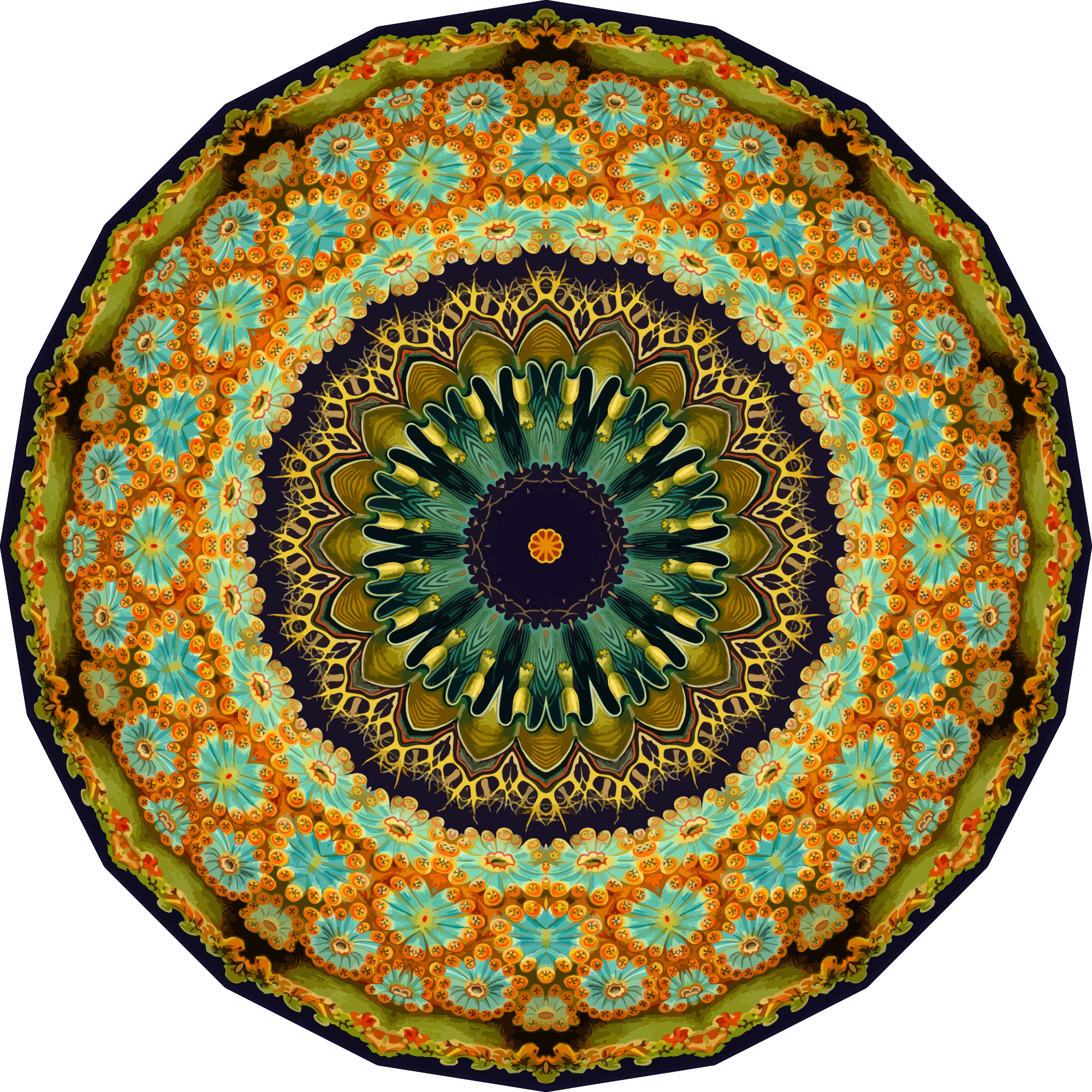 A design with approximate rotational symmetry formed from a drawing of ascidiae by Ernst Haeckel. The design was drawn as a PNG in Paint.net by repeated rotation of wedges of the drawing around a centre point. It was vectorized in Vector Magic
