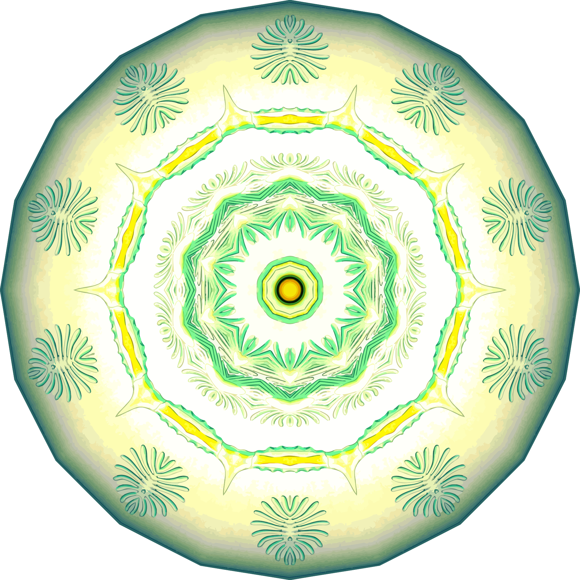 A design with approximate rotational symmetry formed from a drawing of aquatic invertebrate animals by Ernst Haeckel. The design was drawn as a PNG in Paint.net by repeated rotation of wedges of the drawing around a centre point. It was vectorized in Vector Magic