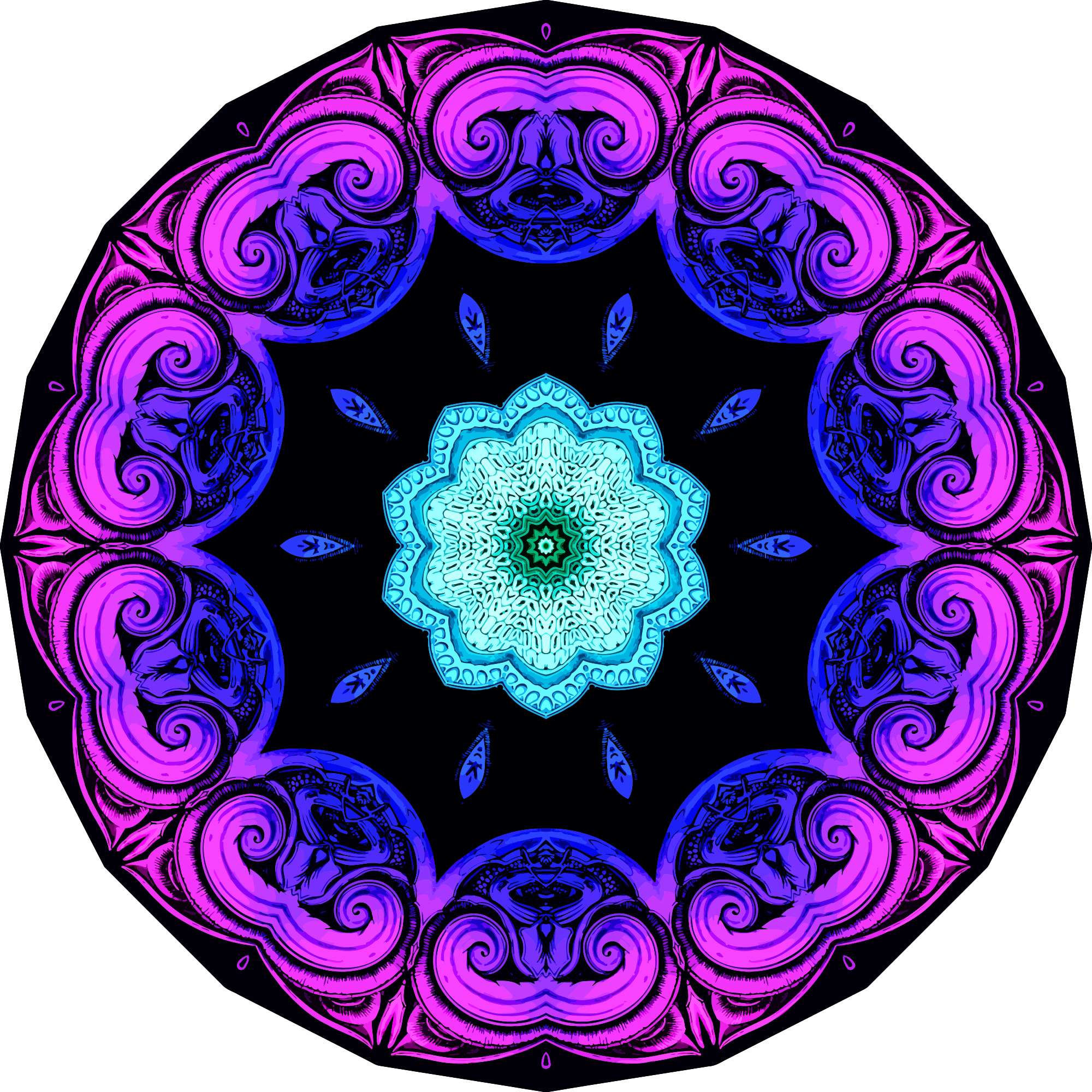 A design with approximate rotational symmetry formed from a drawing of annelid fanworms by Ernst Haeckel. The design was drawn as a PNG in Paint.net by repeated rotation of wedges of the drawing around a centre point. It was vectorized in Vector Magic