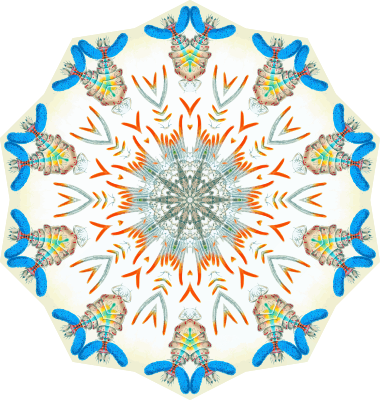 A design with approximate rotational symmetry formed from a drawing of crustaceans by Ernst Haeckel. The design was drawn as a PNG in Paint.net by repeated rotation of wedges of the drawing around a centre point. It was vectorized in Vector Magic