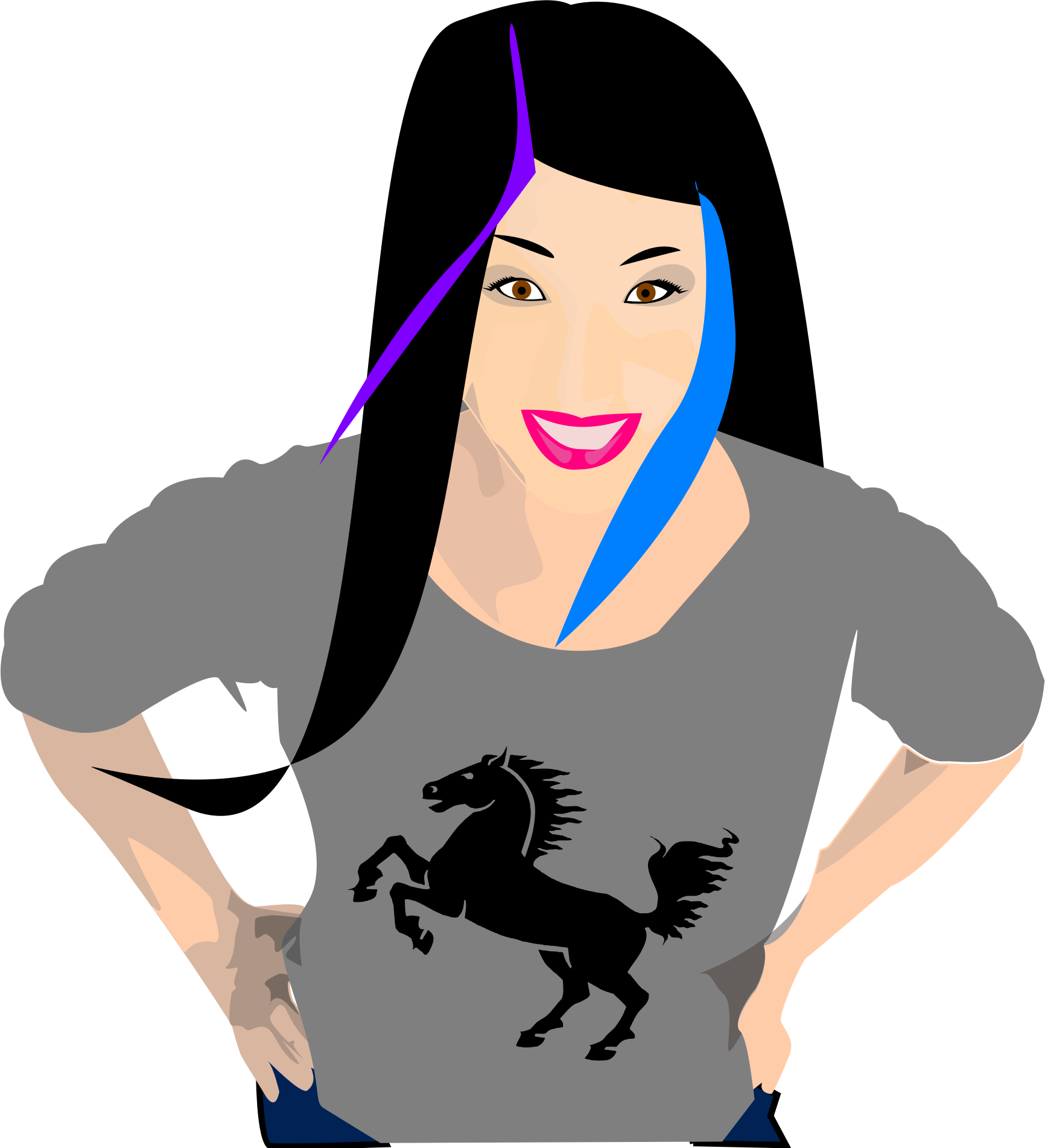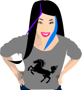 Black haired girl with two coloured stripes on her hair, one blue and one purple.
