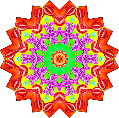 A design with approximate rotational symmetry formed from a wildlife drawing by Ernst Haeckel with freaky added colour. The design was drawn as a PNG in Paint.net by repeated rotation of wedges of the drawing around a centre point. It was vectorized in Vector Magic