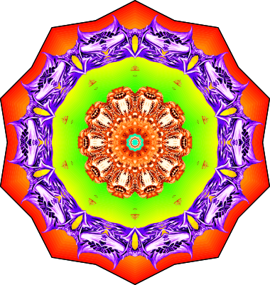A design with approximate rotational symmetry formed from a wildlife drawing by Ernst Haeckel with freaky added colour. The design was drawn as a PNG in Paint.net by repeated rotation of wedges of the drawing around a centre point. It was vectorized in Vector Magic