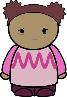 Front view of sad pig-tailed girl in purple and pink.