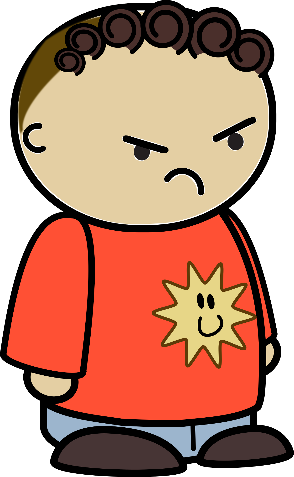3/4 side view of unhappy brown-haired boy in jeans and an orange shirt with a smiling star on front.