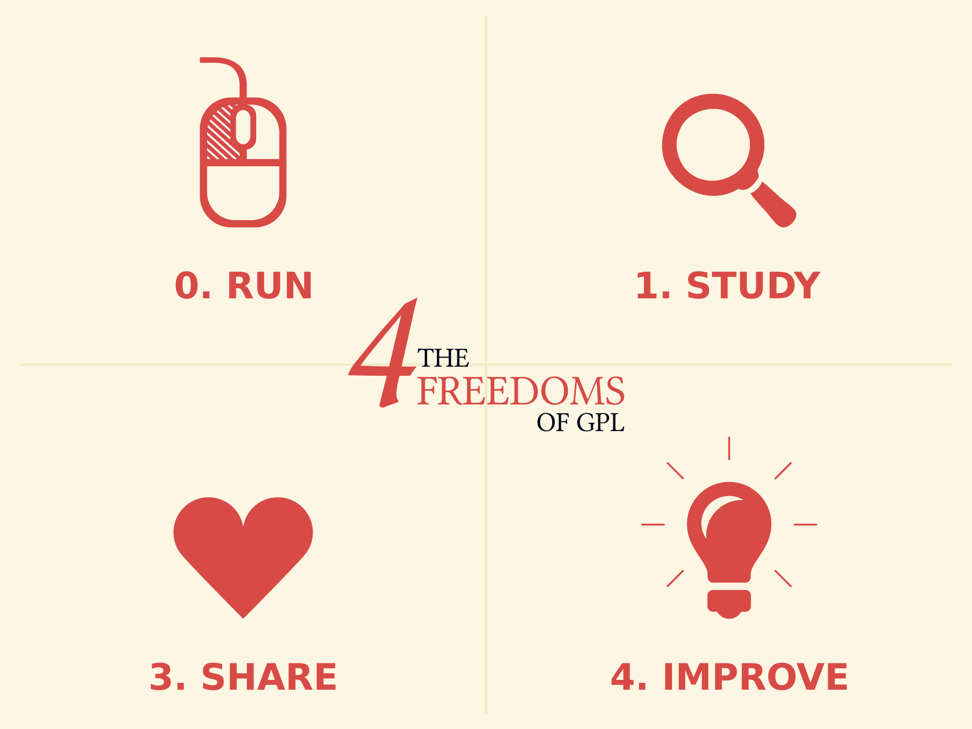 The four freedoms guaranteed by Free Software Licenses. Fonts are Sans Serif and Linux Libertine. Made with Inkscape and public domain cliparts on OCA