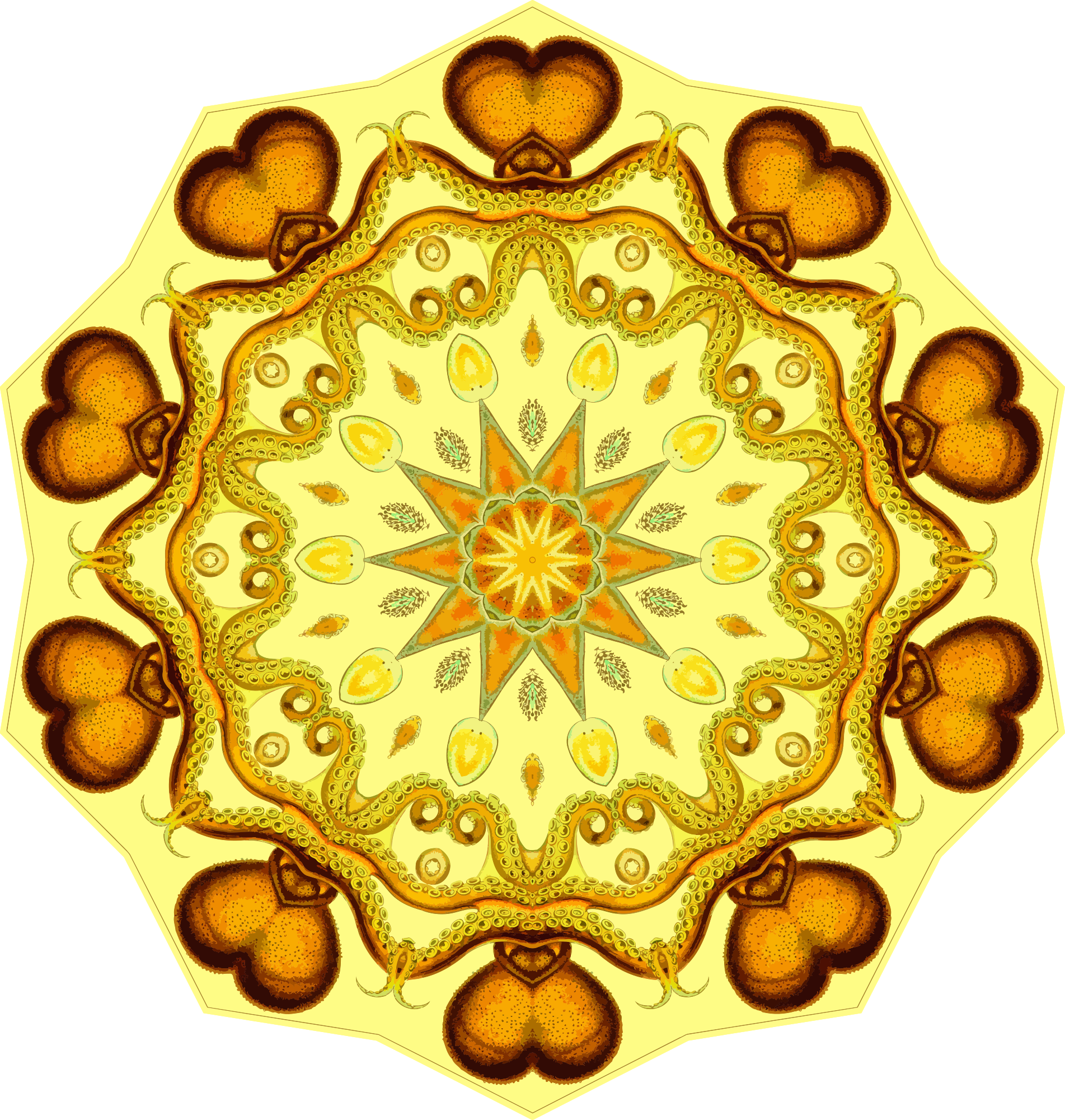 A design with approximate rotational symmetry formed from a drawing of octopus by Ernst Haeckel. The design was drawn as a PNG in Paint.net by repeated rotation of wedges of the drawing around a centre point. It was vectorized in Vector Magic