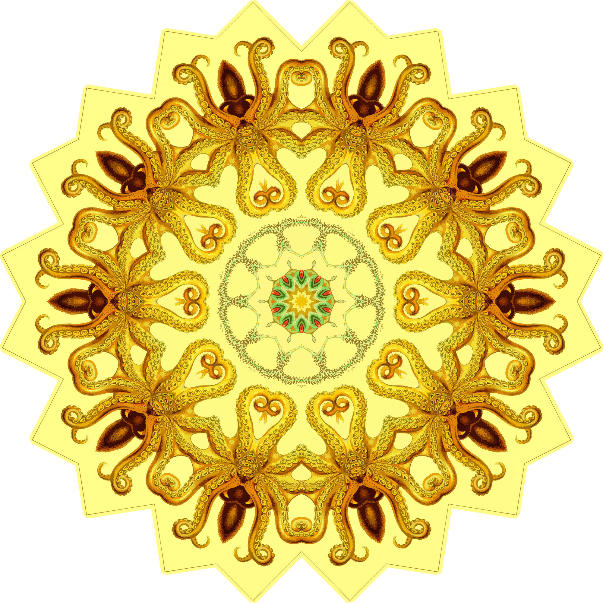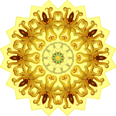 A design with approximate rotational symmetry formed from a drawing of octopus by Ernst Haeckel. The design was drawn as a PNG in Paint.net by repeated rotation of wedges of the drawing around a centre point. It was vectorized in Vector Magic