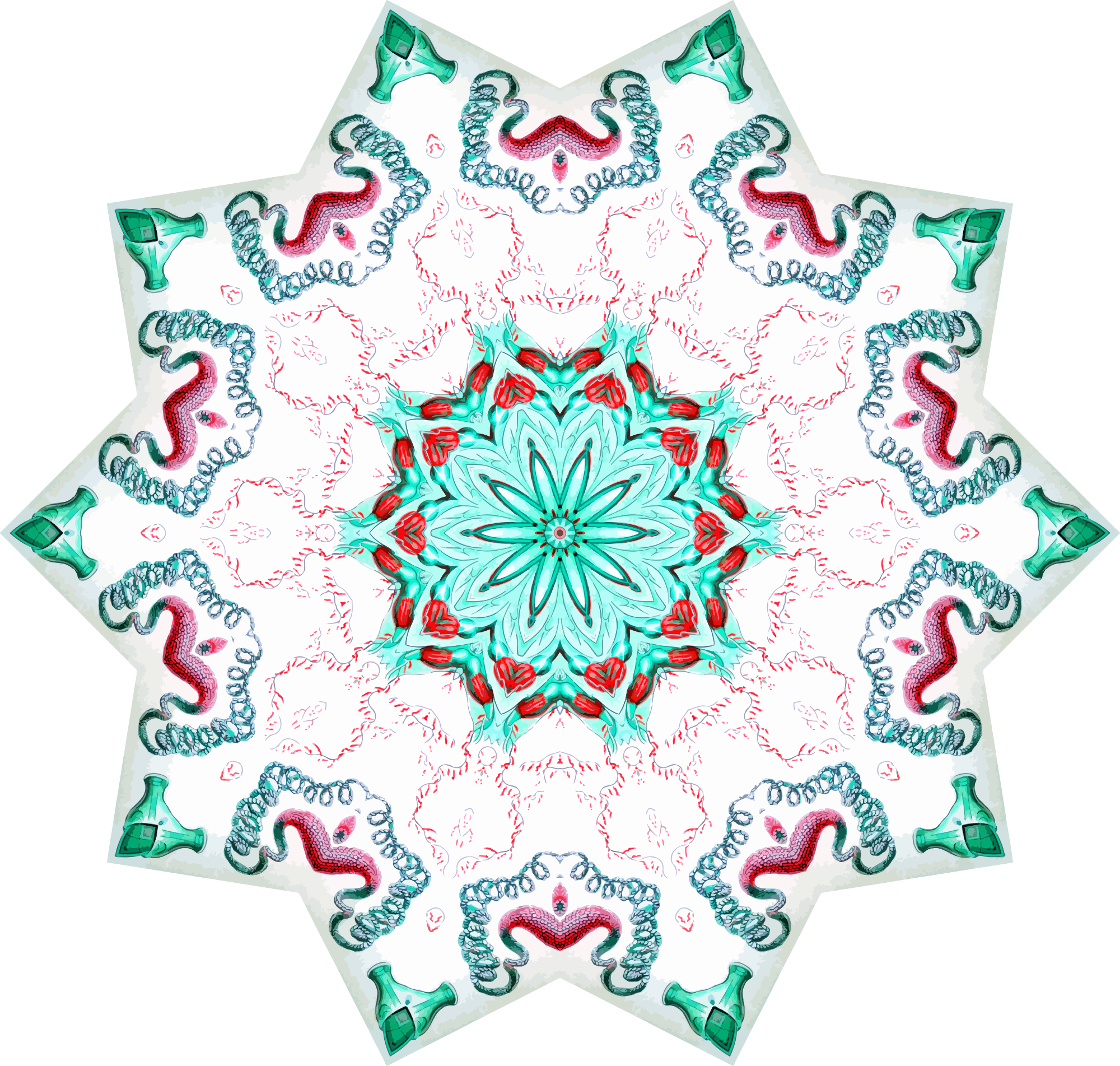 A design with approximate rotational symmetry formed from a drawing of hydrozoa by Ernst Haeckel. The design was drawn as a PNG in Paint.net by repeated rotation of wedges of the drawing around a centre point. It was vectorized in Vector Magic