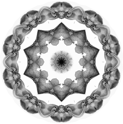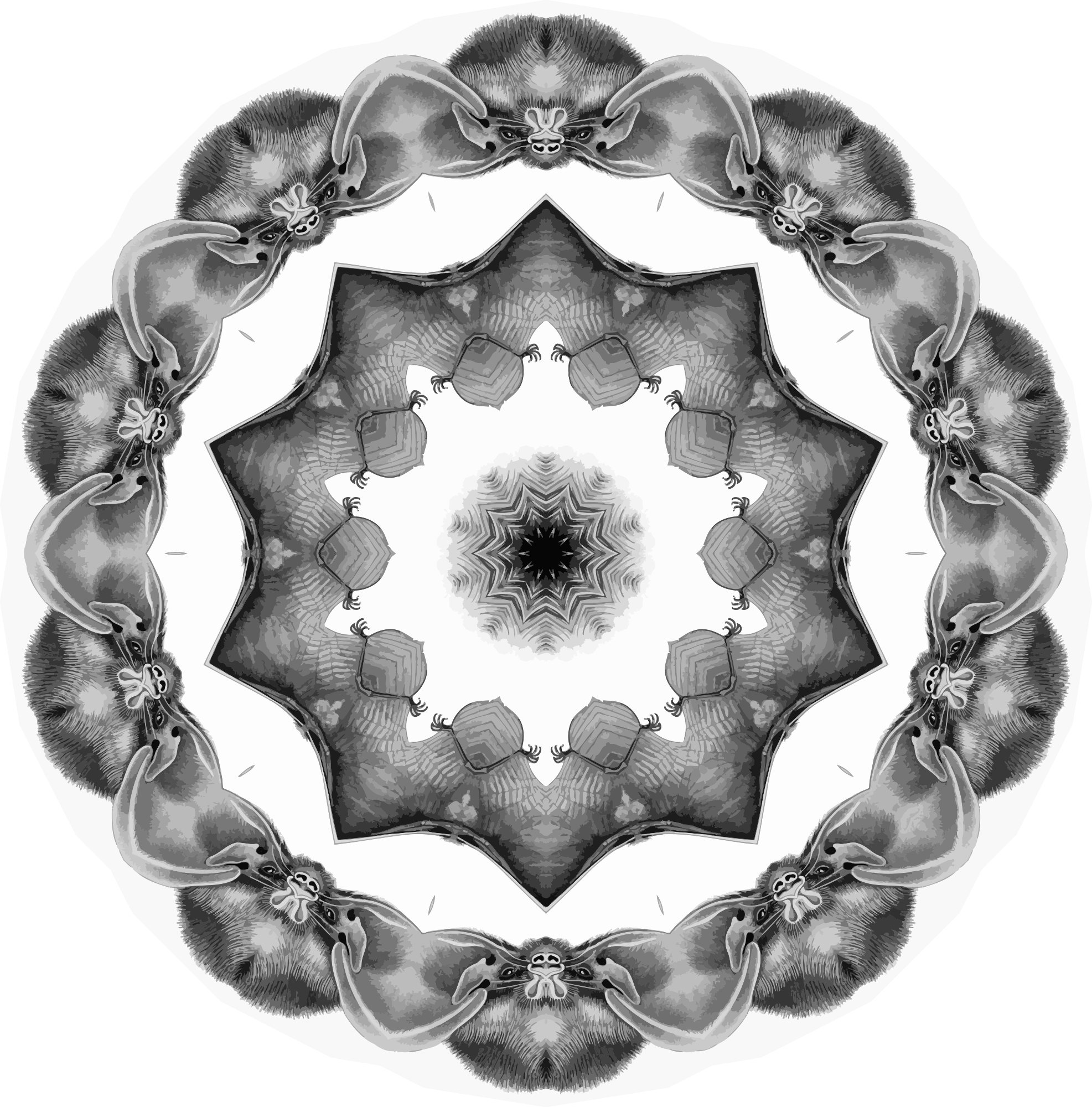 A design with approximate rotational symmetry formed from a drawing of bats by Ernst Haeckel. The design was drawn as a PNG in Paint.net by repeated rotation of wedges of the drawing around a centre point. It was vectorized in Vector Magic