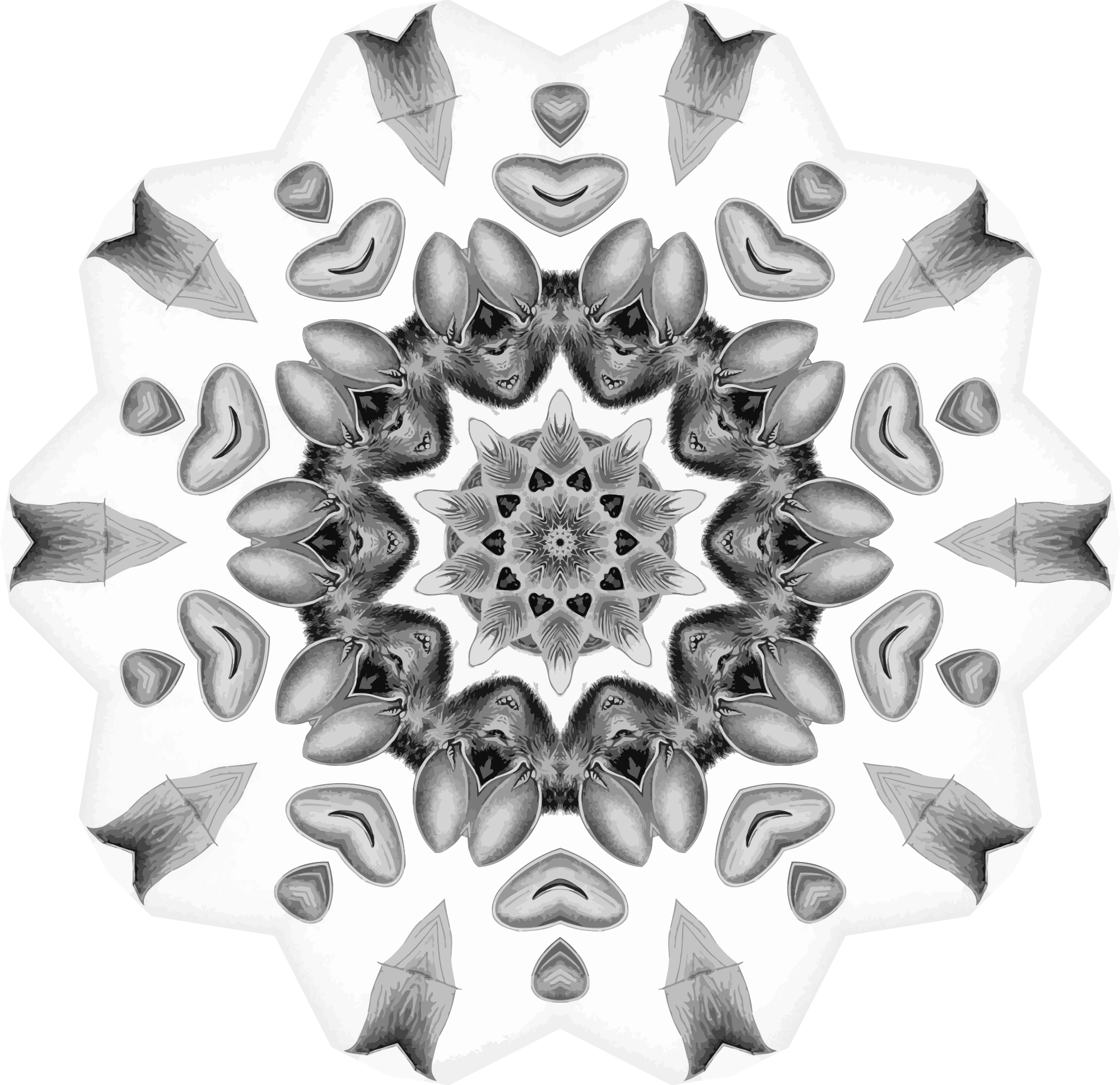 A design with approximate rotational symmetry formed from a drawing of bats by Ernst Haeckel. The design was drawn as a PNG in Paint.net by repeated rotation of wedges of the drawing around a centre point. It was vectorized in Vector Magic