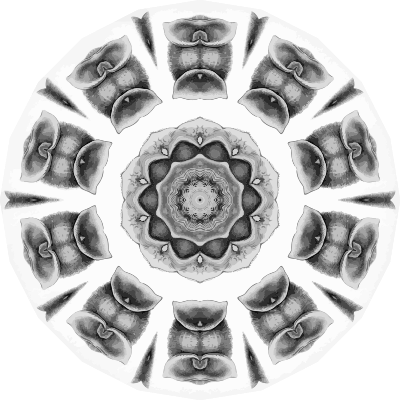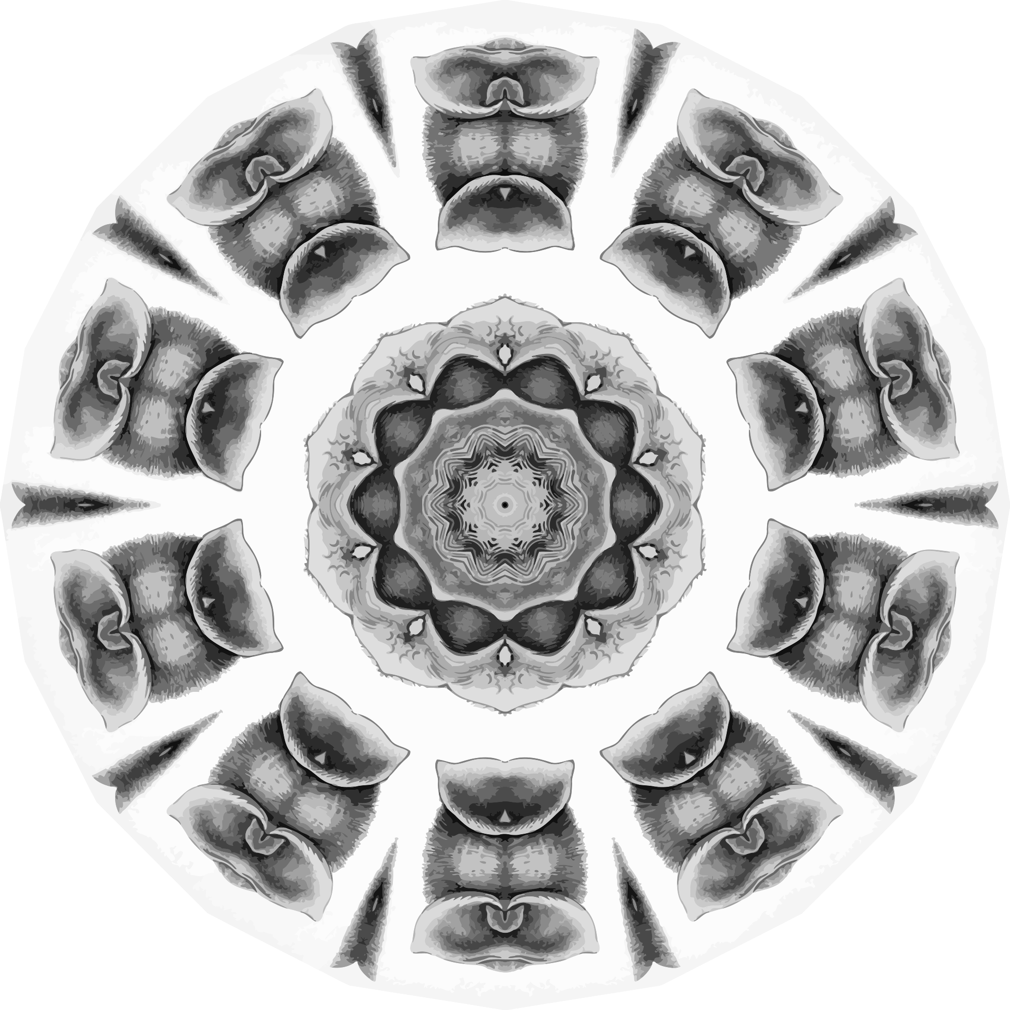 A design with approximate rotational symmetry formed from a drawing of bats by Ernst Haeckel. The design was drawn as a PNG in Paint.net by repeated rotation of wedges of the drawing around a centre point. It was vectorized in Vector Magic
