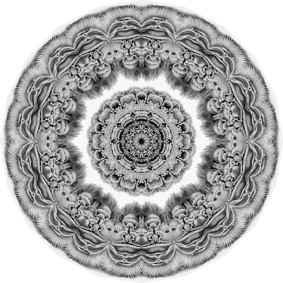 A design with approximate rotational symmetry formed from a drawing of bats by Ernst Haeckel. The design was drawn as a PNG in Paint.net by repeated rotation of wedges of the drawing around a centre point. It was vectorized in Vector Magic