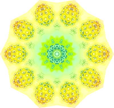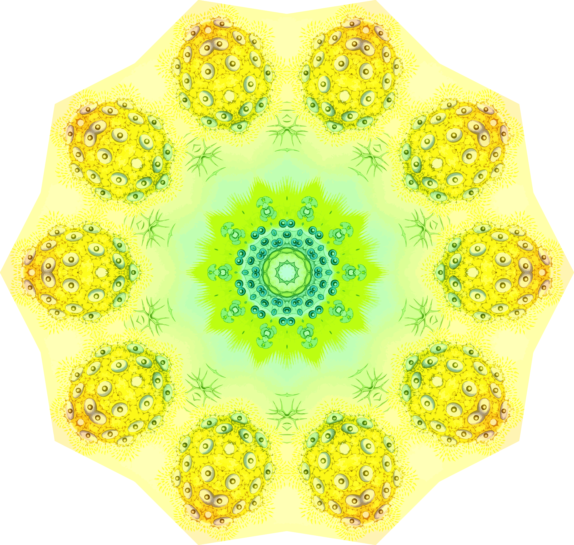 A design with approximate rotational symmetry formed from a drawing of radiolaria by Ernst Haeckel. The design was drawn as a PNG in Paint.net by repeated rotation of wedges of the drawing around a centre point. It was vectorized in Vector Magic